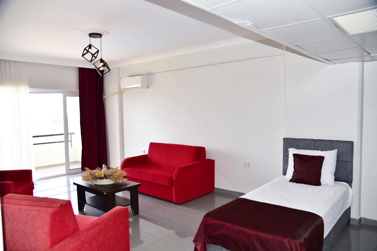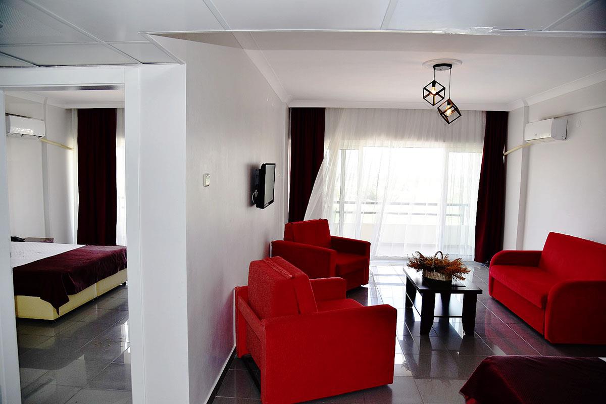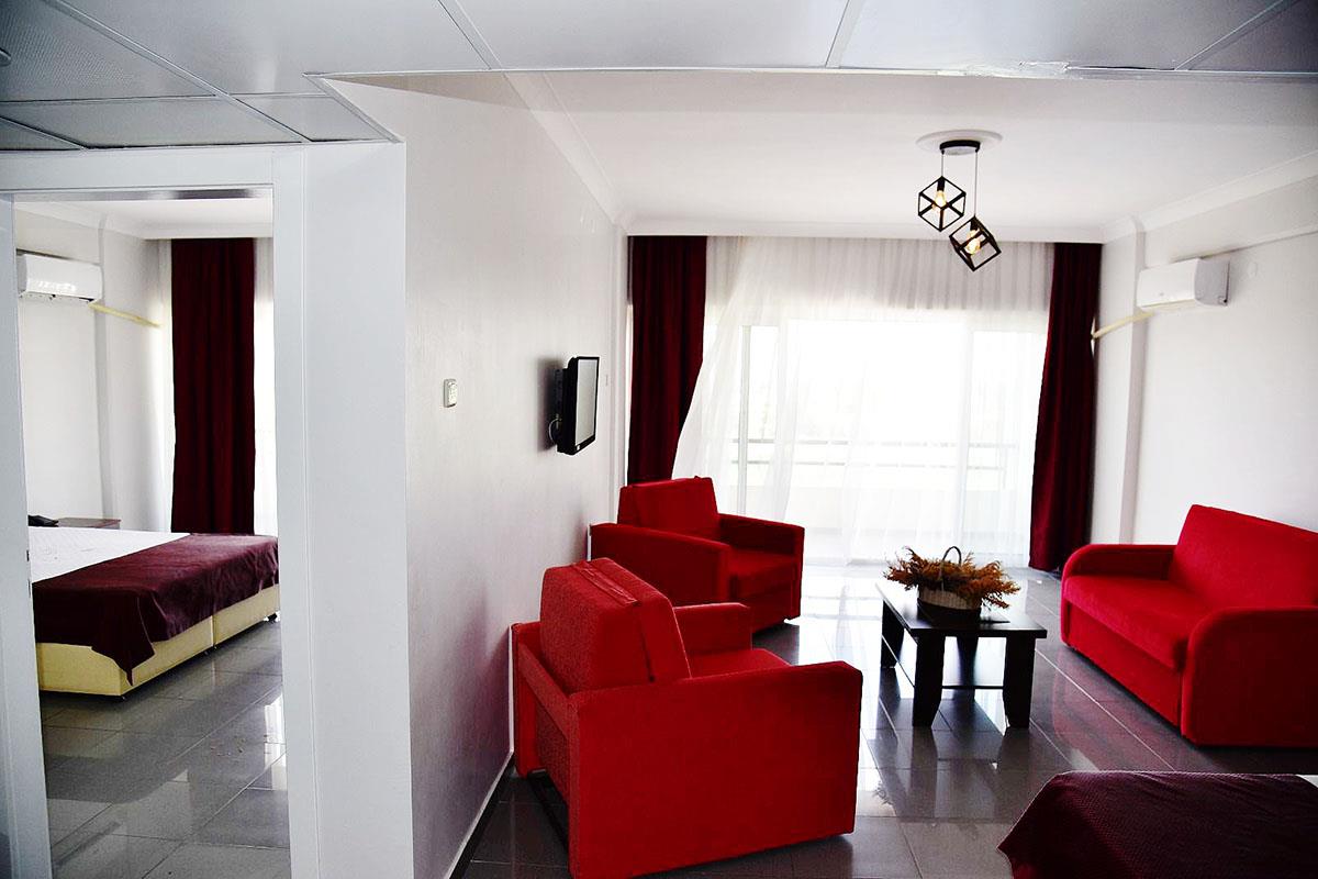 Our suite city view rooms are 57 m2 in size. In our 1+1 Suite rooms, there is a double bed in one room and a seating group and a single bed in the other room. There is a TV unit in both rooms. At the same time, our Suite rooms provide accommodation for up to five people with a seating group that converts into a bed. There is a desk-wireless-mini refrigerator-hair dryer-phone-split air conditioner-electric kettle. The tea and coffee set-up that greets our guests at the entrance is our offering to our guests.